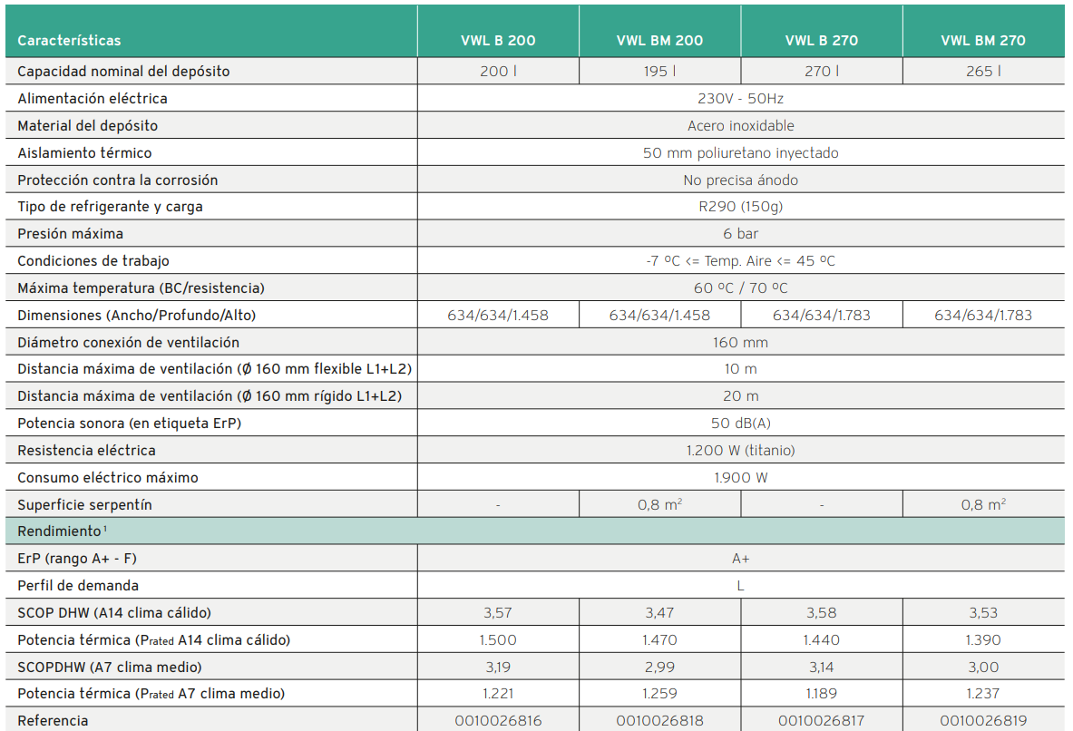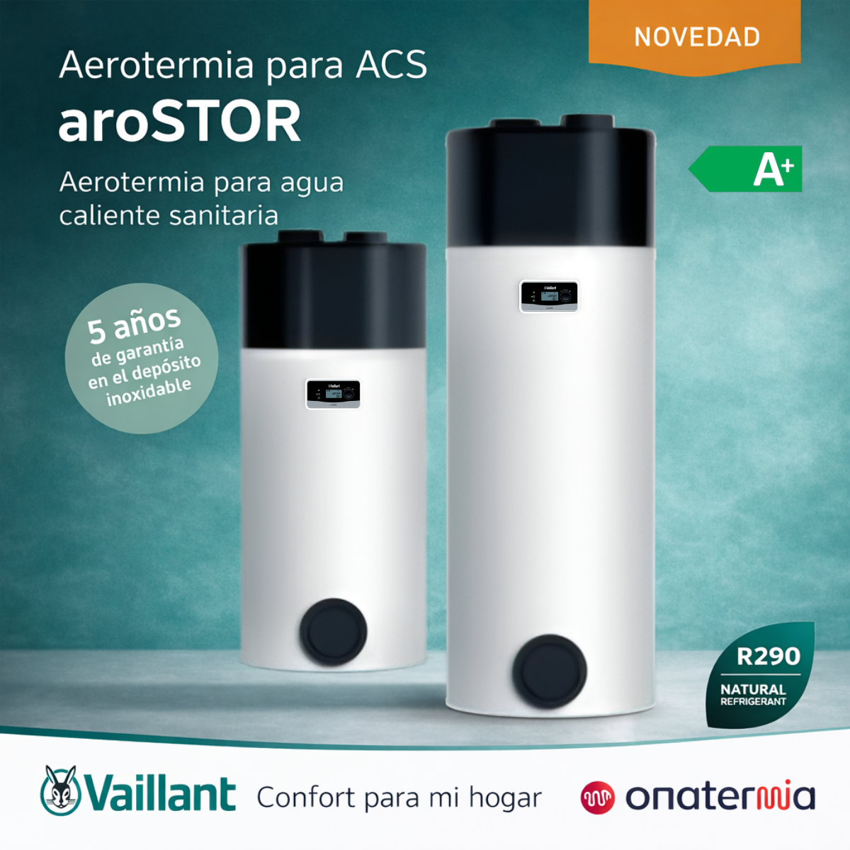 Bomba de calor compacta ACS Vaillant aroSTOR VWL B 200. Sistema de aerotermia de alto rendimiento para la producción de agua caliente sanitaria con eficiencia energética A+. Diseñado para maximizar el ahorro energético y el confort en el hogar.