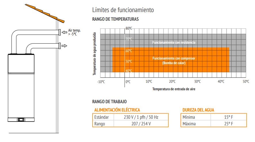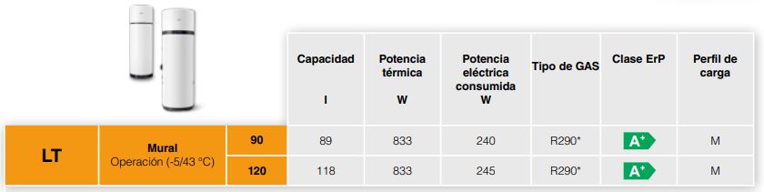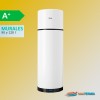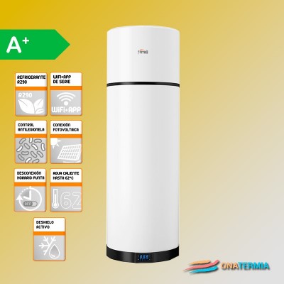 Bomba de calor aire-agua con acumulador integrado con capacidad nominal de 89 lts para producción de agua caliente sanitaria. Sistema de desescarche activo que permite trabajar al equipo con temperaturas de aire de hasta -5ºC sin apoyo eléctrico. Instalación mural. Refrigerante ecológico R290 de bajo impacto ambiental. Programa antilegionela automático. Panel de control integrado y conexión WiFi incluida de serie. Control remoto mediante APP en el móvil. Clase Erp A+. Perfil de carga M.