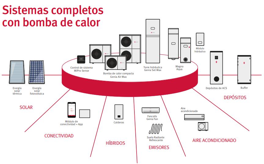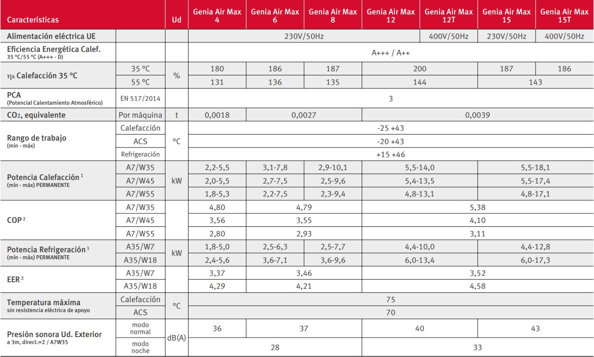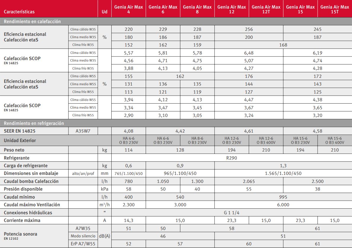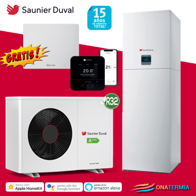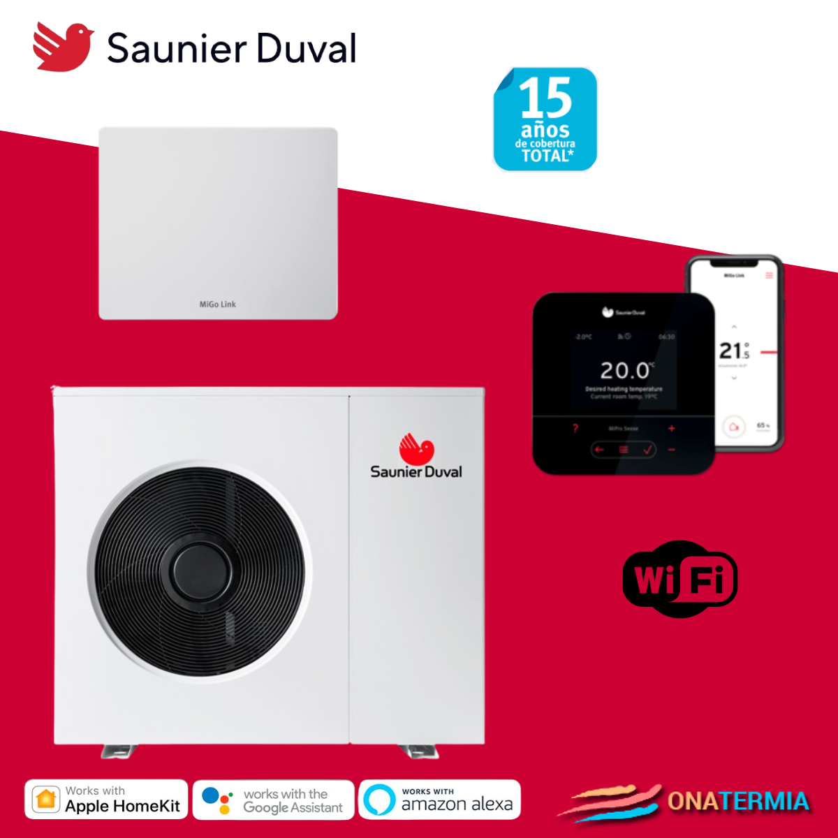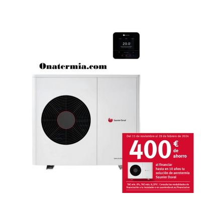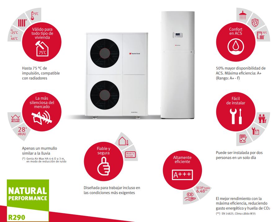 Bomba de calor inverter monoblock Saunier Duval Genia Air Max 4 con una potencia de 5,5 kw. Combinación óptima de la energía del aire (75%) y la eléctrica (25%) con un refrigerante ecológico tipo R290, ademas tiene una capacidad de 4730 frigorías. Incluye control MiPro sense. Amplio rango de funcionamiento y gran eficiencia energética Entre A+++/A++. Dimensiones compactas 765 x 1100 x 449mm (alto x ancho x profundo). Con Interface y Regulador MiPro sense Cableado de regalo.