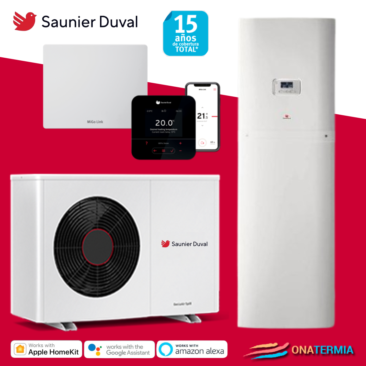 Bomba de calor de aerotermia Saunier Duval PACK GENIA SET MAX 15 con refrigerante R290. Incluye unidad exterior compacta Genia Air Max, una unidad interior, torre hidráulica FW 200-6, equipada con acumulador integrado de 180 litros. Potencia en frío de 12,8 kW y en calor de 18,1 kW. Clase energética A+ con COP de 4,10. Nivel sonoro de tan solo 28dB(A) en modo silencio a una distancia de tres metros es apenas un murmullo similar a la lluvia.
