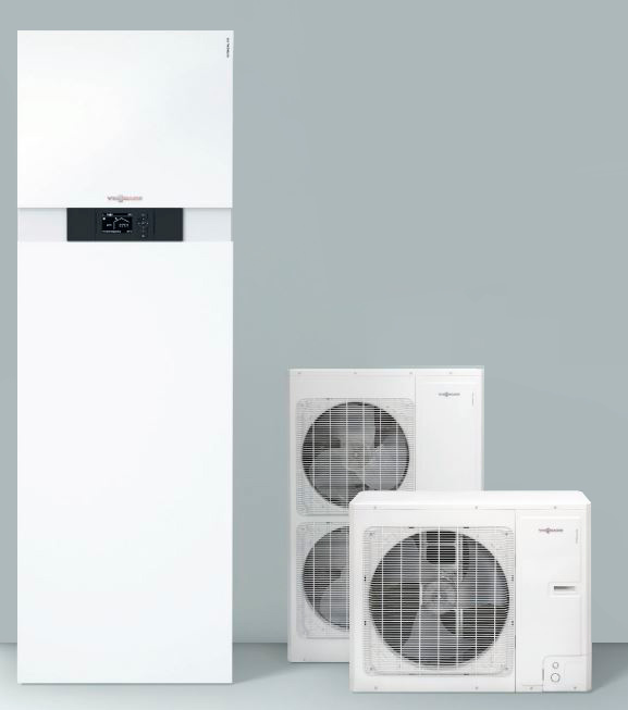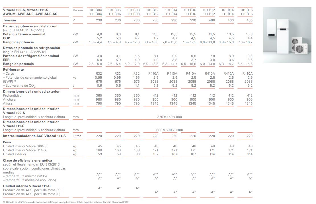 Bomba de calor compuesta por la unidad interior 111.B08 + unidad exterior AWBT-M-AC con interacumulador integrado de 220 litros. Posibilidad de refrigeración con función "active cooling". Refrigerante R32 altamente eficiente. Eficiencia energética de clase A+++. Potencia nominal calefacción 8,13 kW. Potencia nominal Refrigeración 7 kW. Alimentación 230V. Fácil instalación y mantenimiento. Con la interfaz de Internet Vitoconnect (opcional), pueden conectarse a internet através de la App ViCare gratuita.