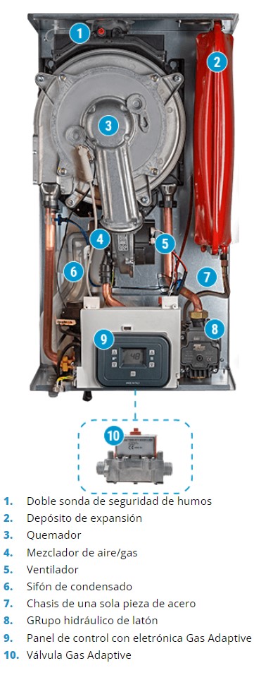 ▶ Nuevo sistema de combustión con tecnología patentada de adaptación de gas (Control Avanzado de Combustión de Gas Adaptativo - A²GC²). La electrónica analiza continuamente la combustión (CO2) a través de la señal de la llama y ajusta la válvula de gas y el ventilador para permitir una combustión adecuada en todas las condiciones de uso. La electrónica permite adaptar fácilmente la caldera a diferentes tipos de gas sin necesidad de intervenciones mecánicas.