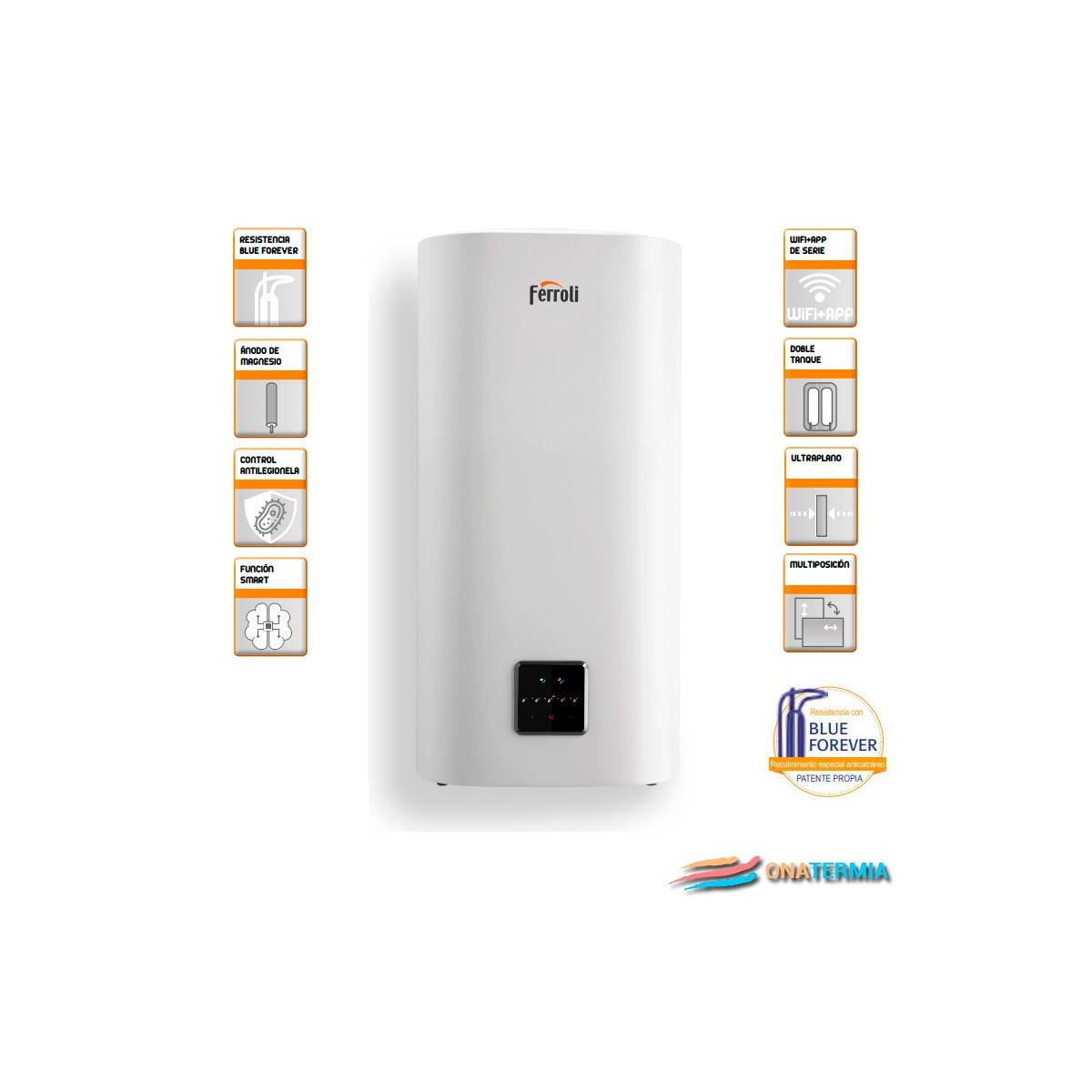 Termo eléctrico multiposición de doble tanque y control vía WIFI. Capacidad de 90 litros. Potencia eléctrica 1800 W. Formato plano de 314 mm de fondo. Función Smart: ahorro de hasta un 20% en el consumo eléctrico. Resistencia anticalcárea Blue Forever independiente del ánodo. Baja fijación de cal: perfecto funcionamiento y larga duración. Función antilegionela